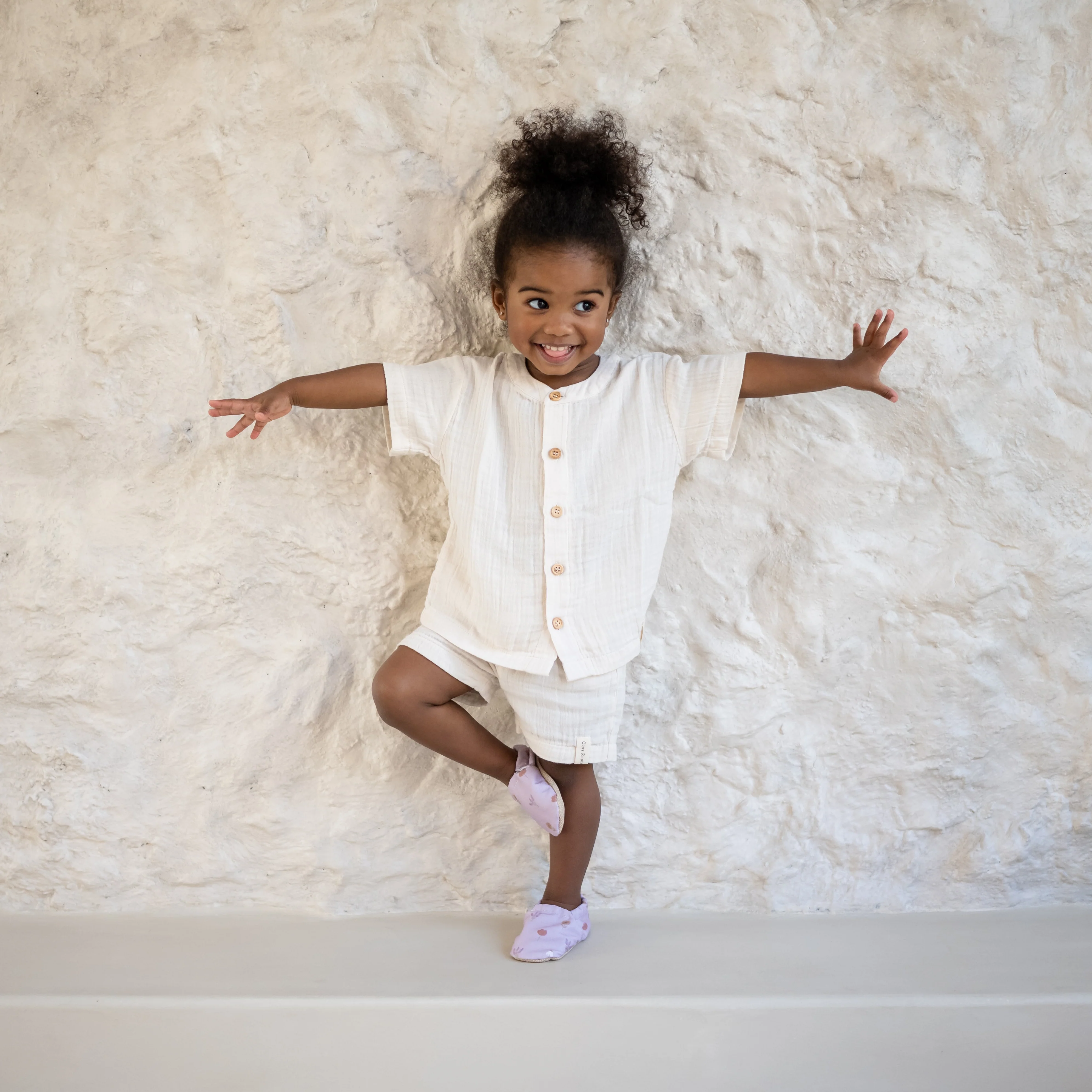 Unsere Organic Muslin Shorts in der warmen Farbe Sand sind der perfekte Begleiter für sonnige Tage. Gefertigt aus besonders weichem GOTS-zertifiziertem Bio-Musselin, fühlen sie sich angenehm leicht auf der Haut an und sorgen für maximalen Komfort beim Spielen und Entdecken.