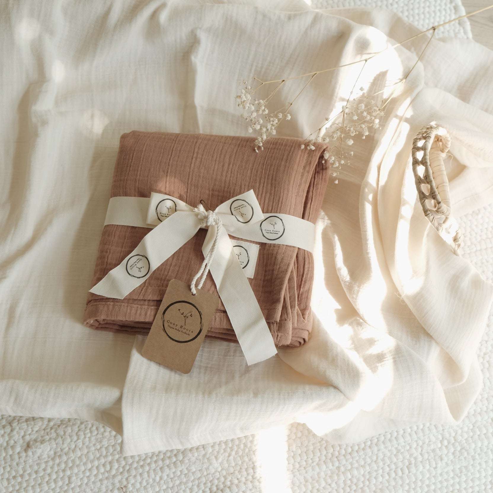 Unser Musselin Tuch hat eine Größe von 120x120cm und ist ein wunderbares Essential, das in keiner Ausstattung fehlen darf.