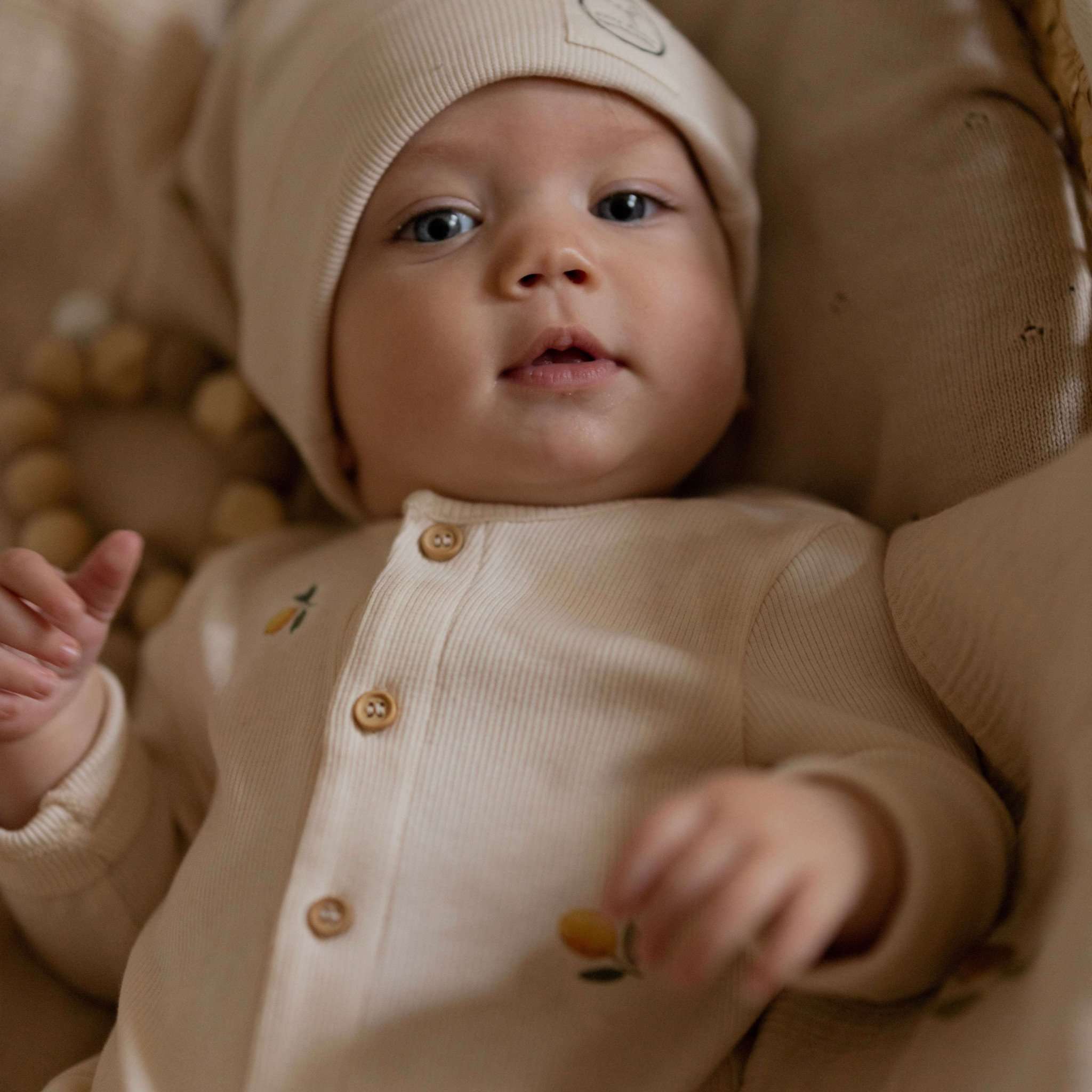Kuschelig weicher Strampler aus GOTS-zertifizierter Bio-Baumwolle in unserem exklusiven Design Pure Lemon.