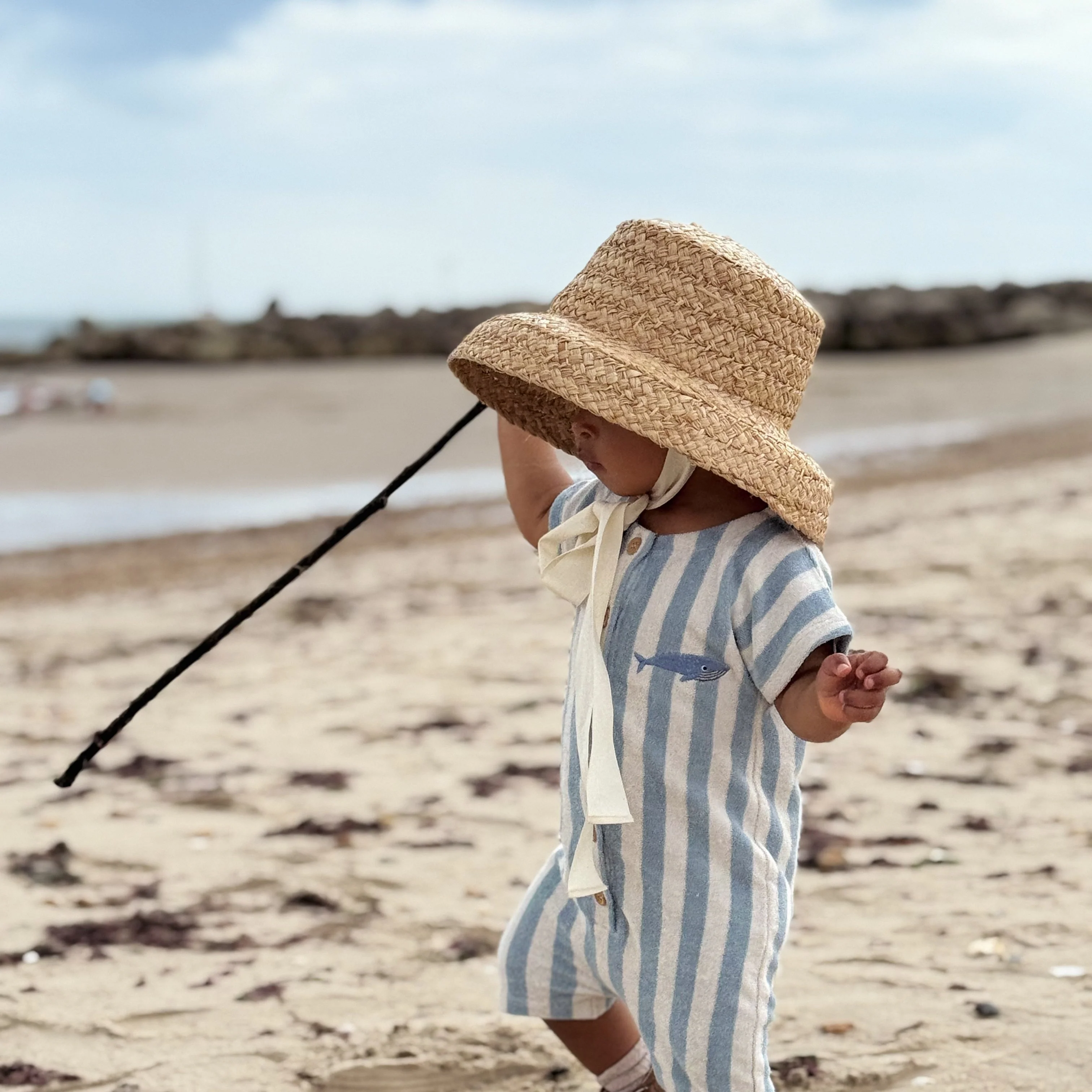 Organic Onesie aus kuschelig weichem Bio Frottee in unserem Blue Striped Design und einer niedlichen Wal-Stickerei auf der Brust.