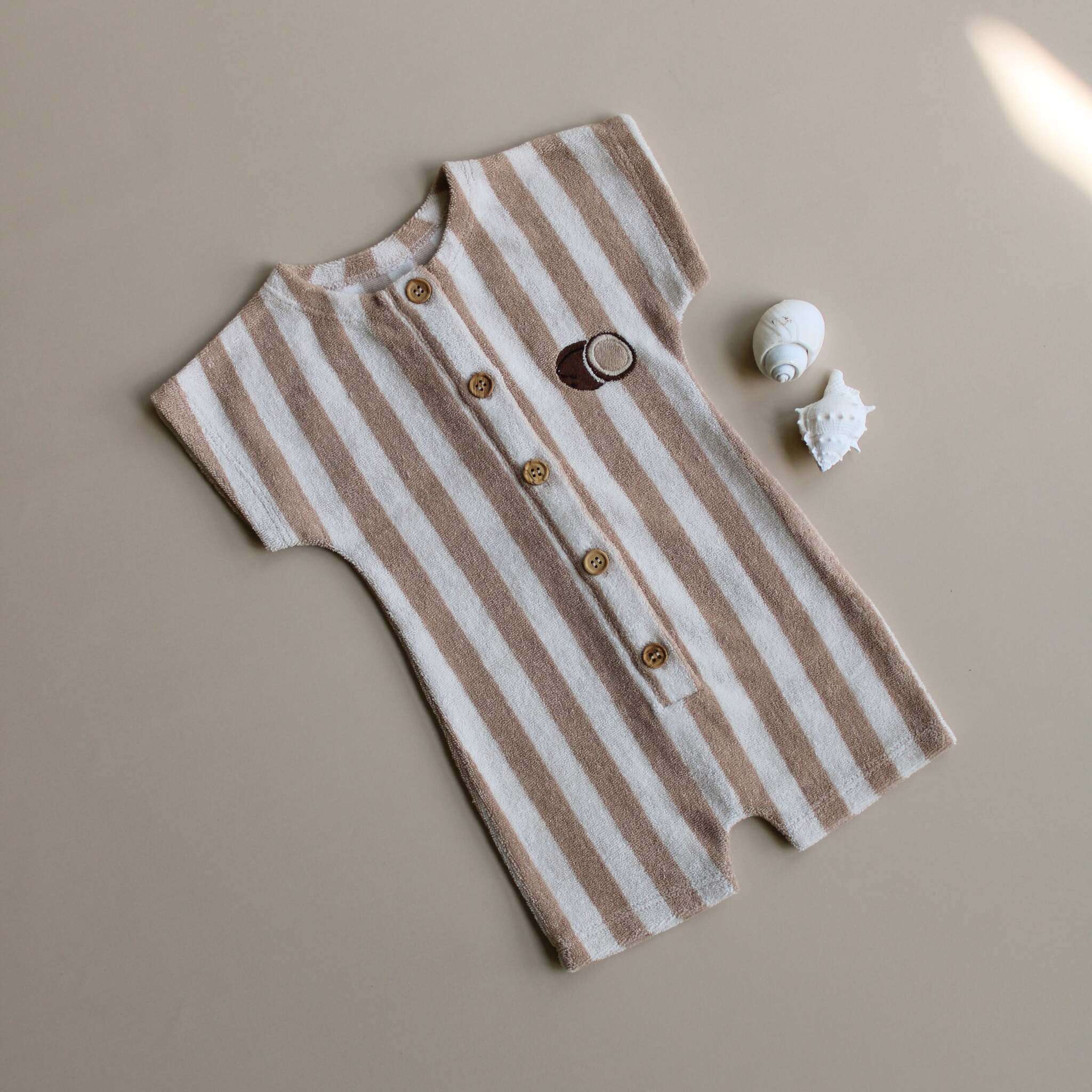 Organic Onesie aus kuschelig weichem Bio Frottee in unserem Latte Striped Ton und einer eingestickten Kokosnuss auf der Brust.