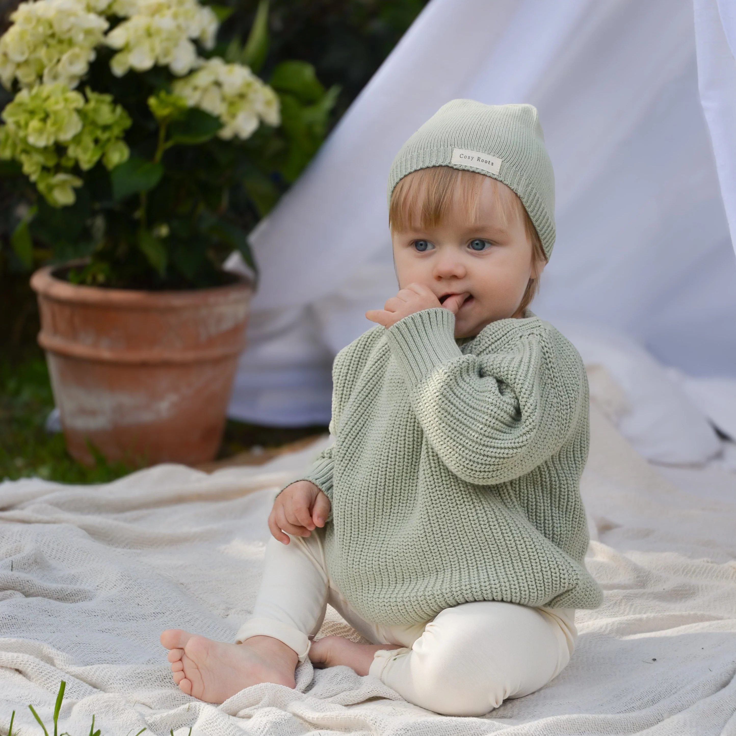 Kreiere perfekte Looks indem du den Strickpullover mit unseren Leggings, Beanies, Schals und Schühchen kombinierst.