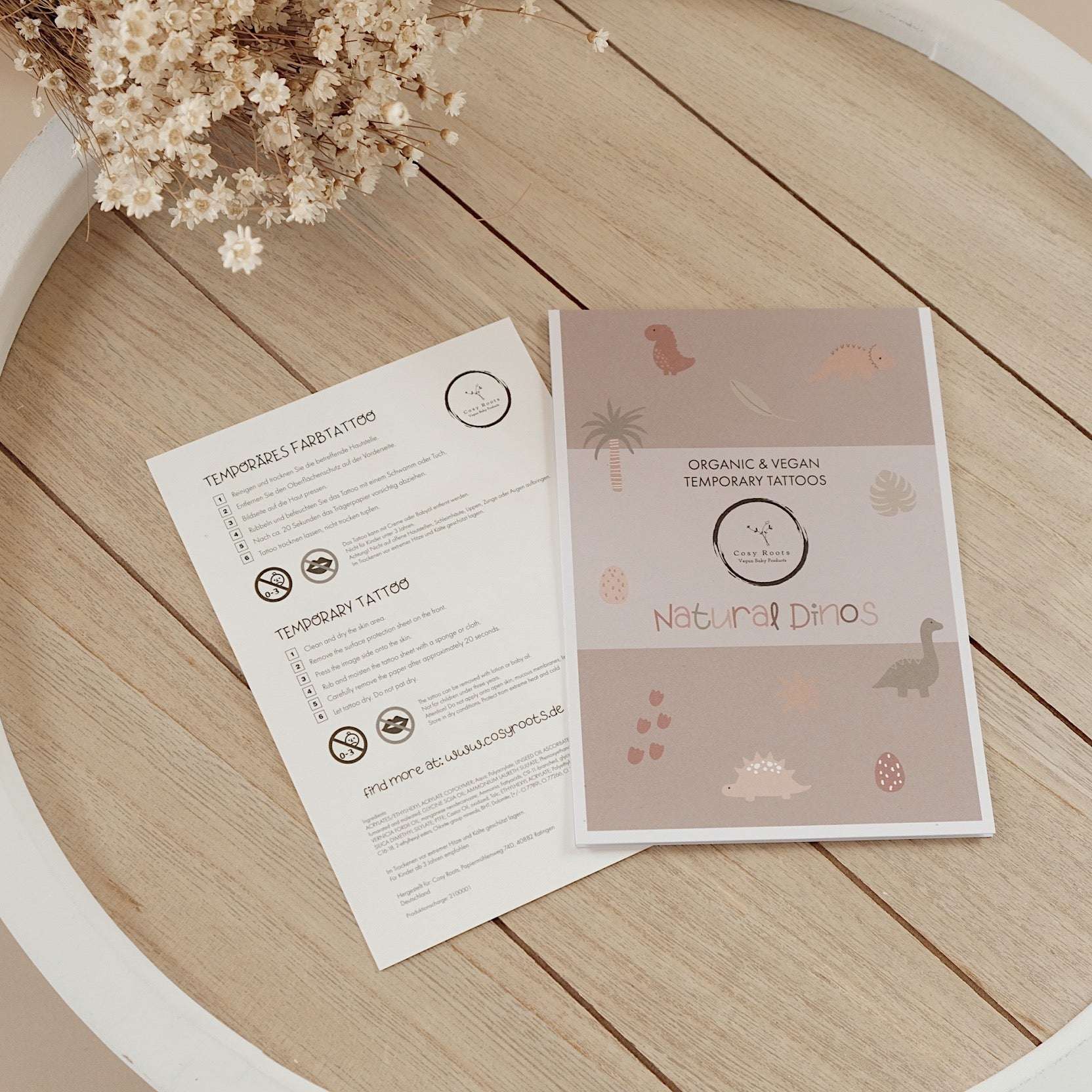 Wunderschöne, von Hand illustrierte Tattoos in unserem exklusiven Design Natural Dinos. Unsere Tattoos sind vegan, natürlich plastikfrei verpackt und lassen sich mit Babyöl ganz leicht wieder von der Haut entfernen.