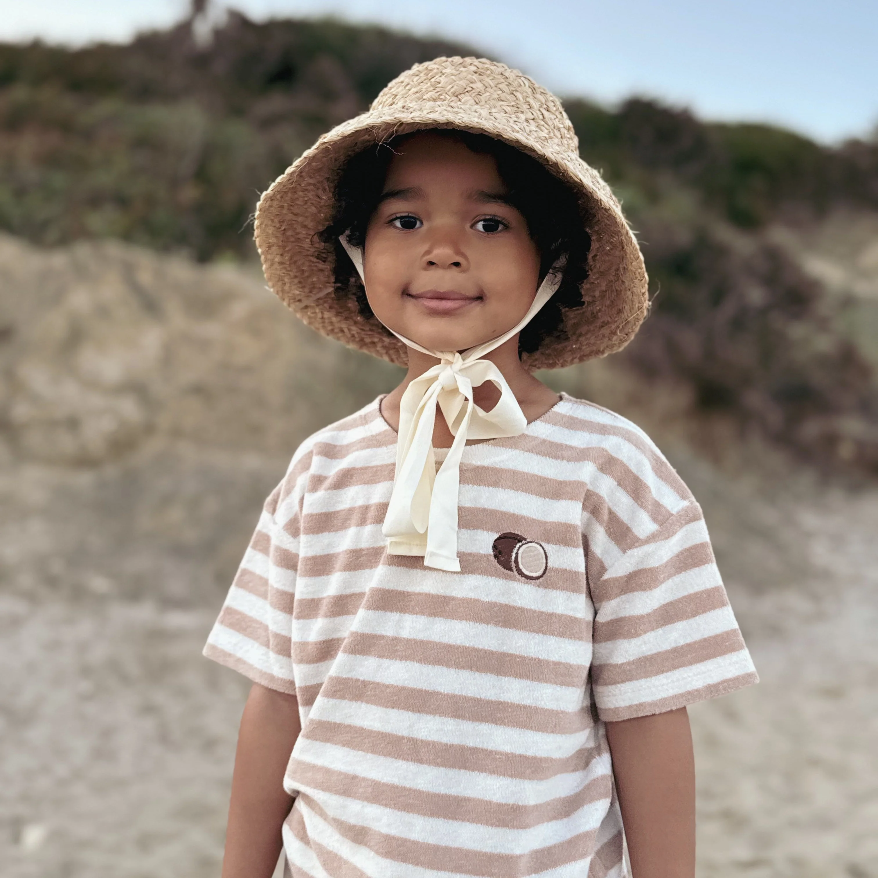 Kuschelig weiches Oversize Shirt aus GOTS-zertifiziertem Bio Teddy Stoff in unserer exklusiven Farbe Latte Striped und einer niedlichen Kokosnuss eingestickt.