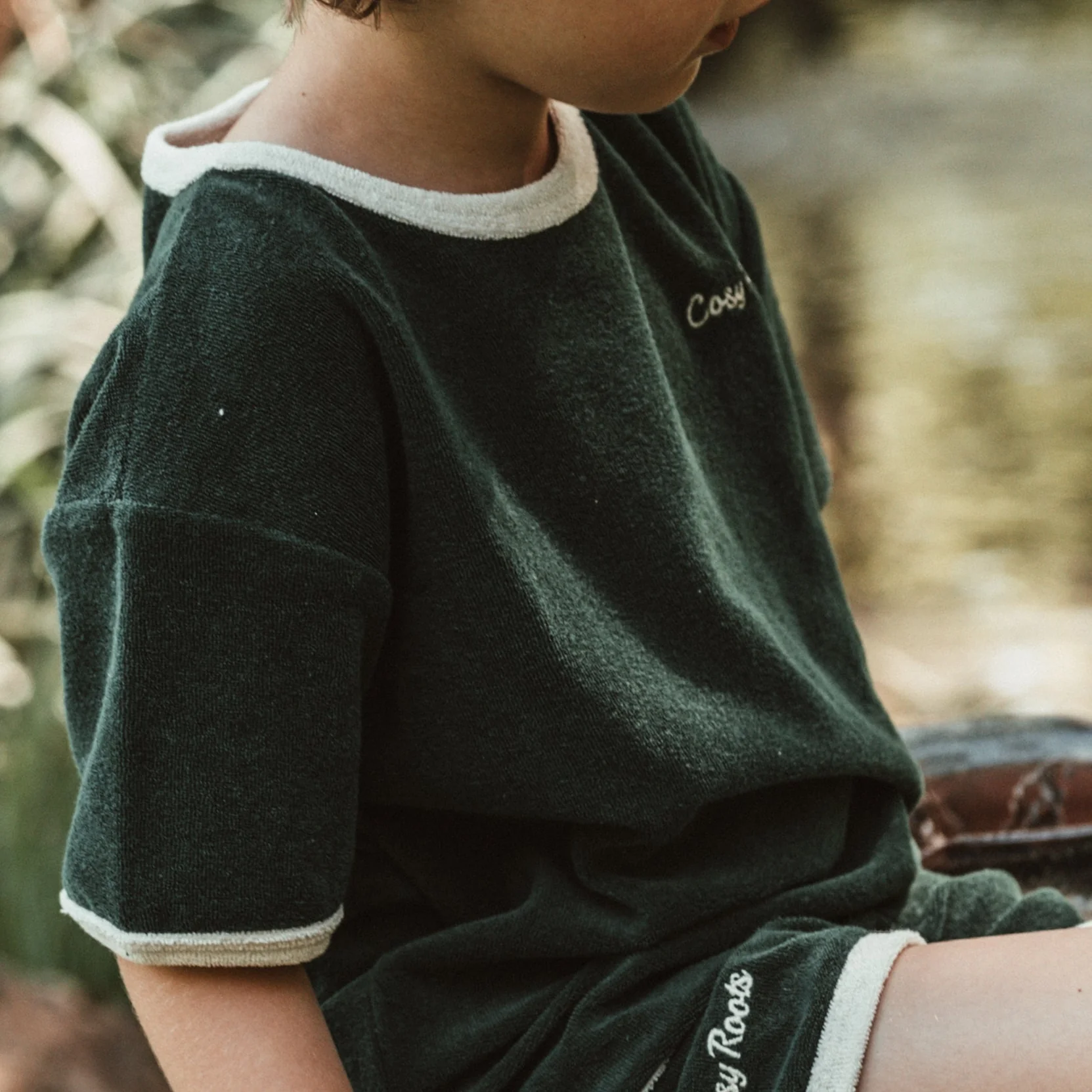 Kuschelig weiches Oversize Shirt aus GOTS-zertifiziertem Bio Teddy Stoff in unserer exklusiven Farbe Vintage Green und dem Cosy Roots Logo eingestickt.