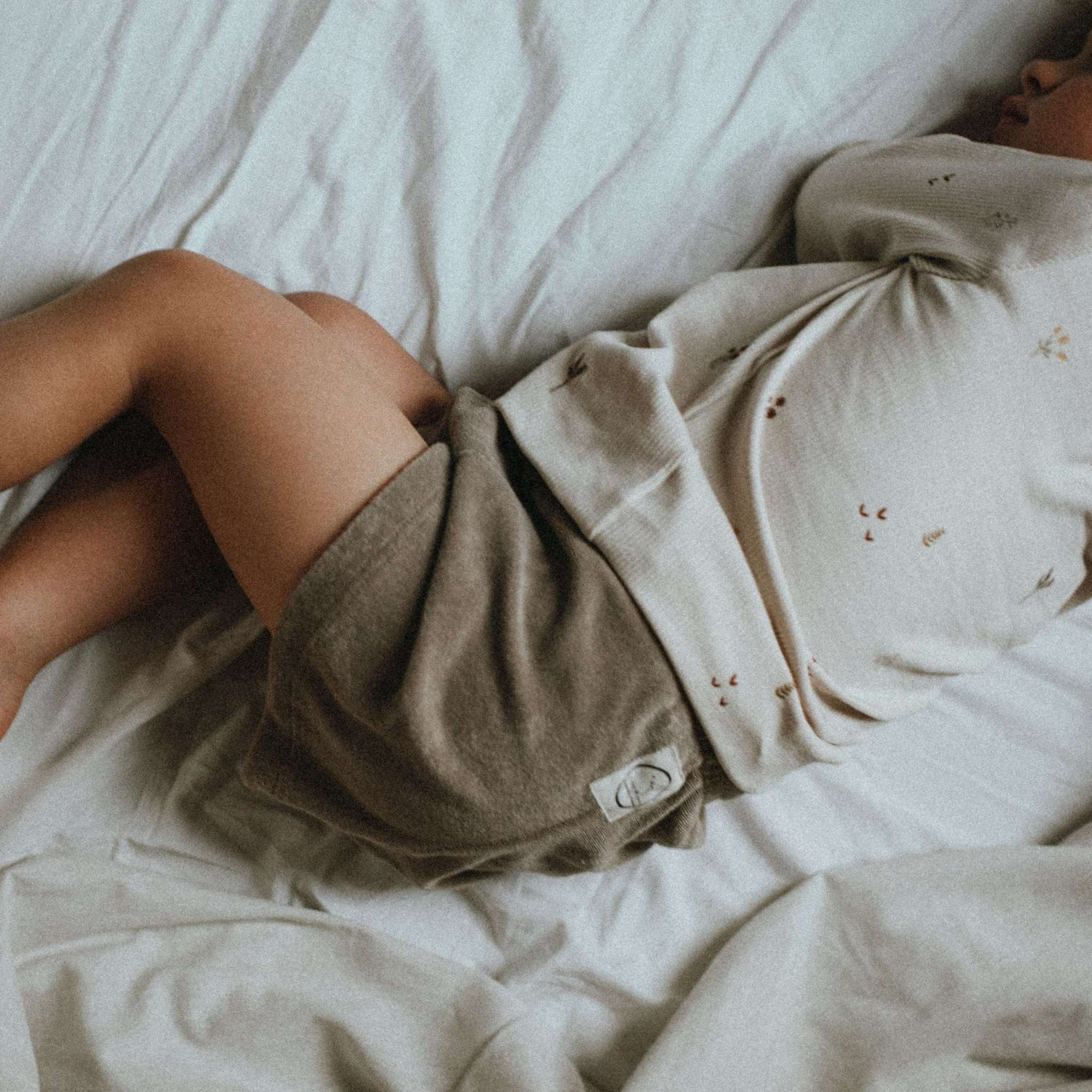 Kuschelig weiche Shorts aus GOTS-zertifiziertem Bio-Frottee in unserer exklusiven Farbe Caramel.