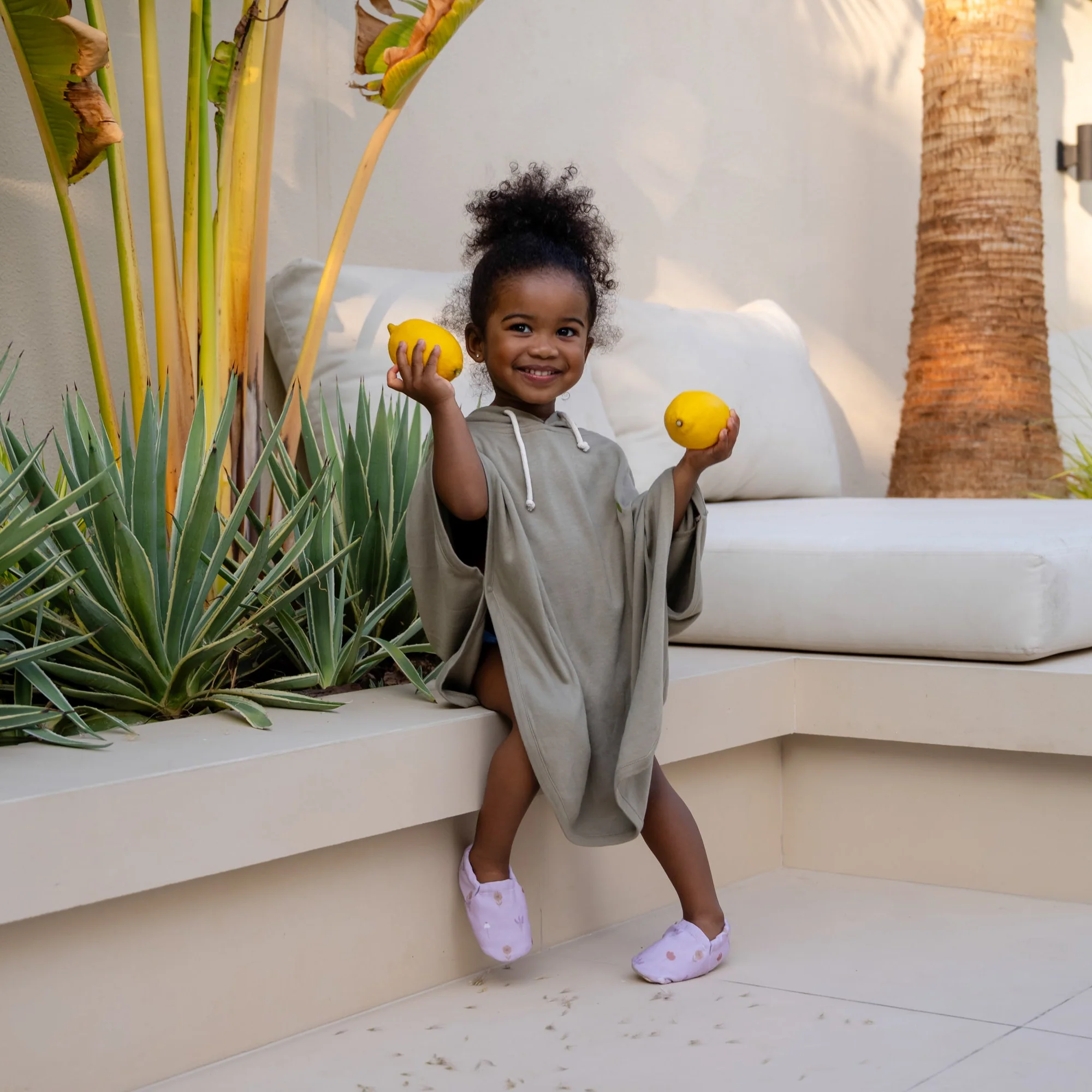Kuschelig weicher UV Poncho mit UPF50+ in unserer exklusiven Farbe Khaki mit eingestickter Zitrone.